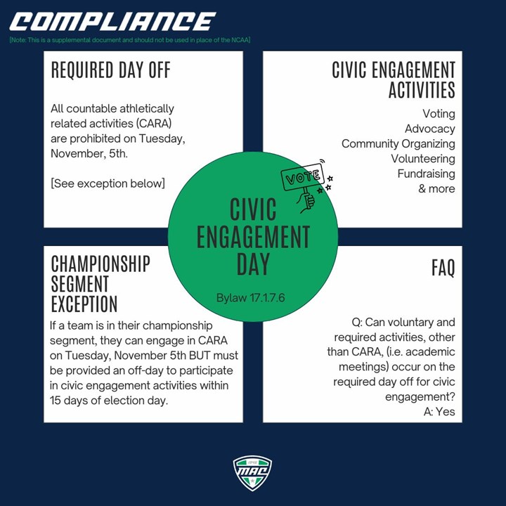 17.02.1) shall be prohibited on the first Tuesday after the first Monday in November. An institution shall develop civic engagement policies, which must address opportunities available to student-athletes for civic engagement, through a collaborative process involving student-athletes, coaches and senior athletics department staff members to ensure student-athletes are provided adequate opportunities, resources and programming to participate in civic engagement activities.